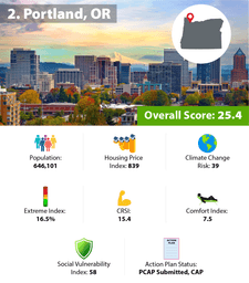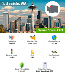 A city’s overall score is best when it is lowest, and the No. 1 best city to live in with climate change has a top score of 24.9